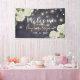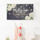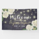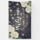 Begrüßung Begrüßungsbanner Vorlagen - Elegante weiße Hydrangea-Blume und String Lights auf Vintagem Navy Blue Floral Linen Hintergrund. Ein perfektes Design für Ihren großen Tag. Alle Textstile, Farben, Größen können an Ihre Bedürfnisse angepasst werden!