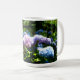 Enjoy the beauty of hydrangea flowers year round with a beautiful coffee mug featuring pink, purple, and blue hydrangea flowers in a garden.