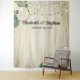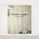 Hintergrund-Vorlagen für Hochzeitskabinen - Elegantes Drehbuch mit Weiß-Hydrangeas-Bläsern und Streichleuchten auf rustikalem Weißen Holzhintergrund. Ein perfektes Design für Ihren großen Tag! Alle Textstile, Farben, Größen können an Ihre Bedürfnisse angepasst werden.