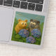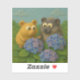 This gentle illustration features a cream-colored hamster and a fluffy gray friend admiring hydrangeas together.