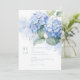 Modern und elegant. Diese hübsche, flache Hochzeitskarte mit Single und Blumenstrauß mit blauen Hydrangeas in voller Blüte, gegen Akzente von blauer Wasserfarbe. Ein Set zeitgenössischer Schriftart schafft einen modernen Ton.