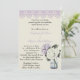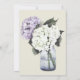 Ein lila Spitzen-Rand und eine wunderschöne Anordnung von Hydrangea Blüten in lila und weiß in einem Ball Glas-Glas-Set von dieser wunderbaren Hochzeitseinladung, die das Thema für Ihre rustikale, Shabby Chic-oder Französisch-Landzeit. Die Hydrangea-Anordnung der Wasserfarbe wird auf der Rückseite des Einladens in großer Größe wiederholt.