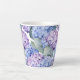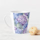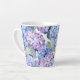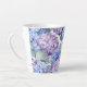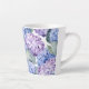 Diese Keramik latte Tasse wird mit einem schönen mehrfarbigen Hydrangea Blumendruck gezeigt. Passen Sie dieses Objekt an oder kaufen Sie, wie es ist. Lizenziertes Bild