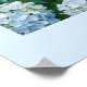 Poster mit einem Foto von hübschen blauen Hydrangeas und einem hellblauen Hintergrund. Passen Sie dieses Objekt an oder kaufen Sie, wie es ist.