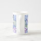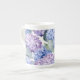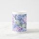Diese Knochen-China Tasse wird mit einem schönen mehrfarbigen Hydrangea Blumendruck gezeigt. Passen Sie dieses Objekt an oder kaufen Sie, wie es ist. Lizenziertes Bild