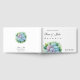 This guest book is shown in a lovely hydrangeas floral print on the front and back of the book. Personalized names and wedding date shown in a black color. Backside has a same hydrangeas image along with personalized names and date near bottom.
