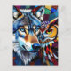 Keep in touch with this colorful vibrant postcard. A vibrant colorful ai illustration of a wolf and an owl in a mosaic stained glass effect.
