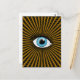 Hypnotic Blue Eye Illustration des blauen Auges mit dunkelgoldenen Sonnenstrahlen, die gerade aus und in wirlem Muster vor schwarzem Hintergrund strahlen. Talisman für Selbsthypnose.