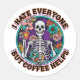 A funny, sarcastic, and colorful design showcases a skeleton clutching a steaming mug of coffee, surrounded by vibrant flowers. The bold text humorously declares, "I hate everyone, but coffee helps." This unique design is available on a wide variety of products, making perfect gifts for coffee lovers.