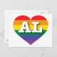 Diese Postkarte zeigt ein Herz mit Regenbogendesign und die fett, weiß, Hauptstadt Buchstaben AL, die offizielle Abkürzung für Alabama, den Yellowhammer-Staat. Die Rückseite der Postkarte ist leer und wartet auf Ihren personalisierten Text oder Ihre handgeschriebenen Gefühle. Zeigen Sie Ihre wahren Farben, unterstützen Sie die Gleichheit der Ehen und feiern Sie Gay Pride. Roll Tide!
