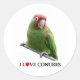 Ein roter maskierter Parakeet mit Kirschköpfen wird mit den Worten "I Liebe conures" und das "O" in "Liebe" durch ein kleines rotes Herz ersetzt