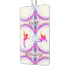 Gymnastik Air Freshener mit regenbogenfarbenen Gymnastik-Silhouetten, einer ist auf ungleichen Bars. Worte sagen: Ich Liebe Gymnastik. Design hat ein farbenfrohes, meist blaues, rosa, lila, abstraktes Design.