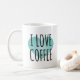 Dieses niedliche und schlichte Design der Tasse zeigt die Worte "I Liebe Coffee" auf einem aquafarbenen Herz. Das perfekte Geschenk für diesen besonderen Kaffeetrinker in Ihrem Leben!