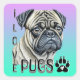 Niedlicher Mops und Pfotendruck, I Liebe Möpsen Aufkleber. Ai Art, die einen niedlichen Mops darstellt. Süßes Geschenk für Hundebesitzer oder Mops Liebhaber. Lila und aquamariner Hintergrund.