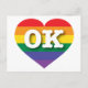 Diese Postkarte zeigt ein Herz mit einem Regenbogendesign und die fett, weiß, Hauptstadt Buchstaben OK, die offizielle Abkürzung von Oklahoma, der früher Staat. Die Rückseite der Postkarte ist leer und wartet auf Ihren personalisierten Text oder Ihre handgeschriebenen Gefühle. Zeigen Sie Ihre wahren Farben, unterstützen Sie die Gleichheit der Ehen und feiern Sie Gay Pride.