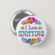 Eine schöne Weise, Ihre Liebe für das Stricken zu zeigen. Genießen Sie diesen Spaßentwurf mit bunten Herzen, Blumen und den Wörtern - i-Liebe-Stricken.