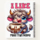 A funny, sarcastic, and colorful design showcases an adorable highland cow holding a steaming cup of coffee. The cow, with big blue eyes and a playful wink, has gray fur. Vibrant text reads, "I like coffee more than people." This charming design is available on various products, making it a perfect gift for coffee lover.
