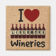 This design features a lineup of red wine bottles collectively labeled "Livermore." The letter "I" and a red heart appear above the bottles, and the word "Wineries" is just below. Together these elements create the message "I Love Livermore Wineries" over a cork print background. Livermore is one of California's oldest wine making regions, joined by Castro Valley, Danville, Pleasanton, San Ramon, and Sunol. Makes a great gift for wine lovers, wine festival participants, or anyone who has visited the Livermore Valley Wine Country.