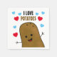 Lustige braune Kartoffel umringt von den Herzen der roten und blauen Liebe mit I Liebe Kartoffeln in schwarz-braunen Buchstaben über seinem Kopf.