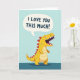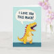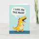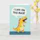 This greeting card features a cheerful cartoon dinosaur standing front and center, ready to show big feelings. The dinosaur is bright yellow with red spines along its back and small teal zig-zag markings across its body. Its tiny arms are held wide, and its open mouth shows simple teeth and a red tongue, giving it an excited, happy expression. Above its head, a large white speech bubble shaped like a soft cloud displays the message “I LOVE YOU THIS MUCH!” in bold, friendly lettering. The background fades from light sky blue at the top to deeper teal near the bottom, with a small shadow beneath the dinosaur for depth. Altogether, this card feels warm and joyful, making it a sweet way to share Valentine’s Day feelings with someone you care about.