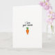 This card shows a simple illustration on a white background, centered on an orange root vegetable character with a tapered shape and a tuft of bright green leaves 🌷. The character has two tiny dot eyes and a small, shy smile that feels like it’s directed at someone special, as if sharing a private joke between friends. Fine, light lines add a bit of natural texture along the orange surface without making the drawing busy. Near the top, the message “I love your carrot” is placed above the character in dark lettering that looks casually written. The spacing leaves plenty of open white area, giving the words and the little figure room to breathe. The orange and green colors stand out clearly against the pale background, keeping the focus on the character’s bashful expression 🐰. The leafy fronds angle upward in a loose cluster, with several rounded tips reaching toward the top edge.