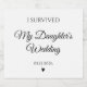 The “I Survived My Daughter's Wedding” design is a personalized gift for the parents of the bride, highlighting their hard work and dedication during wedding planning. It's perfect for post-wedding celebrations, rehearsal dinners, or thank you gifts, bringing humor and joy to any wedding-related event.