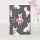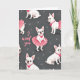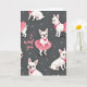This cute Valentine’s Day card features a repeating pattern of white French Bulldogs set against a dark charcoal-gray background. In the center, one Frenchie stands out wearing a bubblegum-pink tutu and a matching heart-shaped collar, posed like a tiny dancer. The dogs have dark, expressive eyes and subtle brow lines that give them a sweet, slightly serious look. Some of the bulldogs appear fully, while others are cropped along the edges, adding visual interest. Soft gray heart shapes are scattered throughout the background for a gentle romantic touch. Across the front, the message “I woof you” is written in soft pink script that stands out clearly against the dark backdrop. It’s a charming choice for dog lovers and a fun way to share affection with someone special on Valentine’s Day.❤️.
