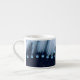 Federn und Diamanten schmücken das herzförmige Design von ZoeSPEAK auf diesem Espresso Cup. Diese originale Foto-Montage wird aus einem Foto eines Holzstorches gemacht und verwendet eine Nahaufnahme der weißen Federn des Vogels, die über dem schwarzen Absturz liegen. Der Hintergrund unter den Federn sieht wie ein dunkelblauer Stoff aus, der diagonal mit neutralen Tönen gesprengt wird. Die glänzenden eisblauen Diamanten heben die Kanten der Federn hervor und dekorieren die hellblaue Form in der Mitte, die ein Monogramm in weißen Buchstaben Set hat, um personalisiert zu sein. Das ganze Bild ist mit einem blass aqua blauen Farbton überzogen, das den Federn und Diamanten weiche Farben verleiht.
