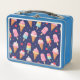Pattern on blue background with creamy ice cream and popsicles, cherries and confetti floating around. Cute whimsical food design.