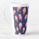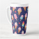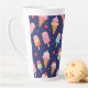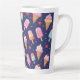 Pattern on blue background with creamy ice cream and popsicles, cherries and confetti floating around. Cute whimsical food design.