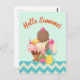 Postkarte, die sagt Hallo Sommer illustriert mit dem zeichn einer 3 Scoop Eis sundae mit bunten Sprinklen. Eine Eistüte mit Schokolade, Erdbeere und Vanille. Eine Schüssel mit neopolitischem Eis und einer Kirsche auf der Oberseite. Erdbeeren und Ananas stehen neben den Schalen. Summerisch und süß.