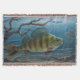 Beneath frozen water, a perch fish notices bait cast by someone ice fishing above.