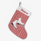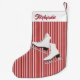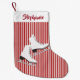 Ice Skater Design Weihnachtsweihnachtsweih Strumpf mit einem weißen Skate vor einem roten und weißen Pfefferminzstreifen Hintergrund, mit anpassbarem Text.