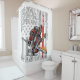 FeuerwehrmannDuschvorhang mit rotem und grauem gepanzertem Kreuzfahrer mit brennender Klinge und christlichem Kreuz. Obwohl ich durch den Schatten des Tales des Todes gehe, befürchte ich kein Übel. Amerikanische Flagge hängt im Hintergrund. Duschvorhänge für Feuerwehrmänner. Verzieren Sie Sie Badezimmer in einem Feuerwehrmannthema!