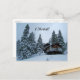 Passen Sie diese Postkarte an. Ändern Sie den Text, Farbe oder fügen Sie Ihre eigene Nachricht! Eine Hütte im Schnee, umgeben von schneebedeckten hohen Kiefernbäumen. Fotografie von Minerva Bloom.