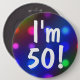 Ein festliches buntes Knopf-Button mit einem Hintergrund bokeh der bunten Partylichter und des Textes sagt: "Ich bin 50!" Einfach, dieses niedliche Abzeichen besonders anzufertigen und mit irgendeinem Alter oder Name, etc. zu personifizieren. Ein glückliches und Spaßknopf-Button für Kinder, Teens und Männer und Frauen irgendeines Alters!