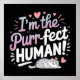 Das Design hat einen reizenden Wortgefecht: "Ich bin der Purr-fect HUMAN!" Das Wort "Purr-fect" ist ein cleveres Stück über das Wort "perfekt". Der Text ist ein Set in einem kühnen, auffälligen Schriftart mit glitzernder, glänzender Textur in einem pastellfarbenen Farbverlauf von Rosa und Blau. Eine kleine, graugestreifte Cartoon-Katze mit einer winzigen Krone befindet sich ganz unten und sieht glücklich und zufrieden aus. Die Grafik ist auch mit kleinen Herzen und Whiskers geschmückt, die ihren spielerischen und liebevollen Ton verstärken. Der schwarze Hintergrund macht die sanften Farben und das funkelnde Licht besonders auffällig. Dies wäre ein ideales Design für einen T - Shirt, eine Tasse oder eine Social Media Post.