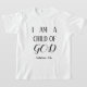 Der T - Shirt dieses Jungen schreibt in schwarz "I AM A CHILD OF GOD", gefolgt von Galatianern 3:26.