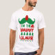 Dieser weiße T - Shirt zeichnet sich durch ein spielerisches Weihnachtsdesign aus. Ganz oben steht ein großer grüner Schnurrbart mit roter Nase, gefolgt vom Text "IM THE" und "DADDY CLAUSE" in festlicher roter Schrift. Eine kleine Weihnachtsmannmütze liegt über "DADDY", grüne Weihnachtsbäume und eine Reihe farbenfroher Lichter vervollständigen das Design und schaffen ein humorvolles Urlaubsthema für eine Vaterfigur.