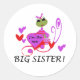 Große Schwestern, die Frösche Liebe geben, werden dieses hübsche Design mit einem Frosch Liebe, viel Herz in lila und rot, und Text, der lautet: "Ich bin die neue große Schwester!". Große Schwestertrötchen, Tasse, Knöpfe, Mousepads, Totensäcke und andere große Schwesterartikel, die mit einem Namen personalisiert werden können!
