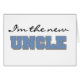 Ich bin die New Onkel T - Shirt, Hoodies, Karten, Baby Ankündigungsknöpfe, Magnete, Schlüsselanhänger und andere stolze neue Onkel-Artikel mit schwarz-blauem Text.
