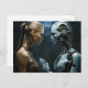 Ein menschliches Weibchen und ihr androides Gegenstück in einem dunklen Korridor, in dem die Lichtquelle von oben kommt. Sie stehen sich gegenüber, beinahe von Nase zu Nase, schauen sich in einem Moment der Anerkennung gegenseitig direkt in die Augen.