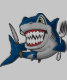 Lustiger Cartoon eines Haifischs mit den enormen Zähnen und Gabel und Messer.