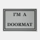 ICH BIN EINE HÜTTE-Begrüßungsmatte. Schwarze Schrift, schwarze Rahmen, hellgrauer Hintergrund.