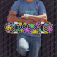 niedliche, bunte Emoji-Gesichter auf einem gemusterten Skateboarddeck