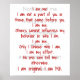 Ich bin ich, ich bin kein Teil von Ihnen oder denen, die vor Ihnen gekommen sind. Ich bin ich. Andere können mein Verhalten nicht beeinflussen oder wer ich bin. Ich bin ich. Nur ich wähle, wer ich bin. Ich bin mein Einsatz. Niemand kann mir etwas Anderes sagen. Ich bin originell. Ich bin MICH.