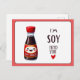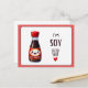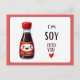Eine niedliche und spielerische Postkarte mit einer lächelnden Sojasaucflasche mit dem Wortspiel "I'm Soy Into You". Ideal, um eine süße und sonderbare Nachricht an jemanden zu senden.