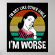 Ich bin nicht wie andere Mädchen - ich bin schlimmer. Dieses lustige sarkastische Anführungszubehör ist ein großartiges Geschenk für eine Frau, Freundin oder Ehefrau, die einen Ruf für schlechte Entscheidungen oder als Störenfried und Liebe Sarkasmus hat. Perfekt für jeden mit einem gesunden Gefühl von Spaß. Das Retro-Set der Hausfrau aus den 50er Jahren des 19. Jahrhunderts gegen einen Vintagen, bedrückten Sonnenuntergang.