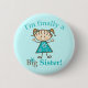 Niedliches Strichmännchenmädchen mit den Türkis-Blumen, zum des neuen Babys anzukündigen sagt, dass "ich schließlich eine große Schwester" bin und die perfekte neue Babymitteilungs-Geschenkidee der großen Schwester bin.