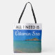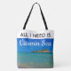 Das ist die perfekte Tasche für jeden Seesüchtigen. Es zeigt das Bild des ultratransparenten kristallinen Wassers des smaragdgrünen Meeres Sardiniens (Italien) mit allen Blautönen, an einem sonnigen Sommertag mit einem klaren blauen Himmel und ein kleines Inselchen in der Ferne. Die Beschriftung, in Schwarz-Weiß-Schriftart, liest Alles, was ich brauche, ist Vitamin Meer.